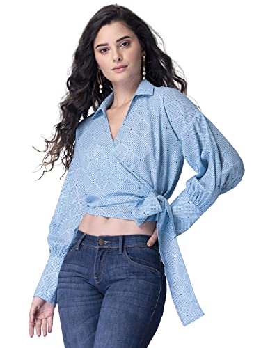 - Elevate your summer style with this cute blue wrap top. Peppered with polka print, it comes with a tie-up detail and puff sleeves. Style Tip: Complete your look with hoop earrings and a simple necklace.