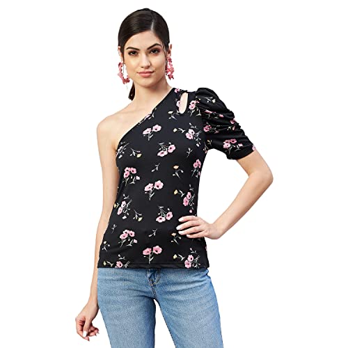 Marie Claire Women Casual Black Print Colour One Shoulder Floral Regular Top