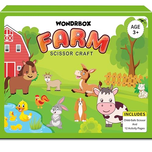 WONDRBOX Scissor Craft Activity Kit for Girls and Boys Age 3 4 5 6 Girls and Boys | Each Pack Includes: 12 DIY 3D Paper Crafts, Child-Safe Scissor and Glue (Farm Animals)