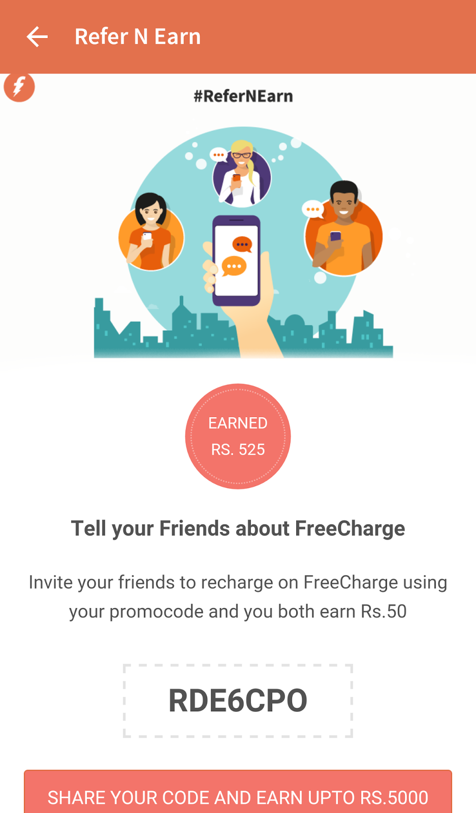 â— Now send invite to your friends and family and you will get 50 Rs. Freecharge Credits when they sign up as new user and do 20 Rs. Recharge via using your refer code as promo code at checkout.