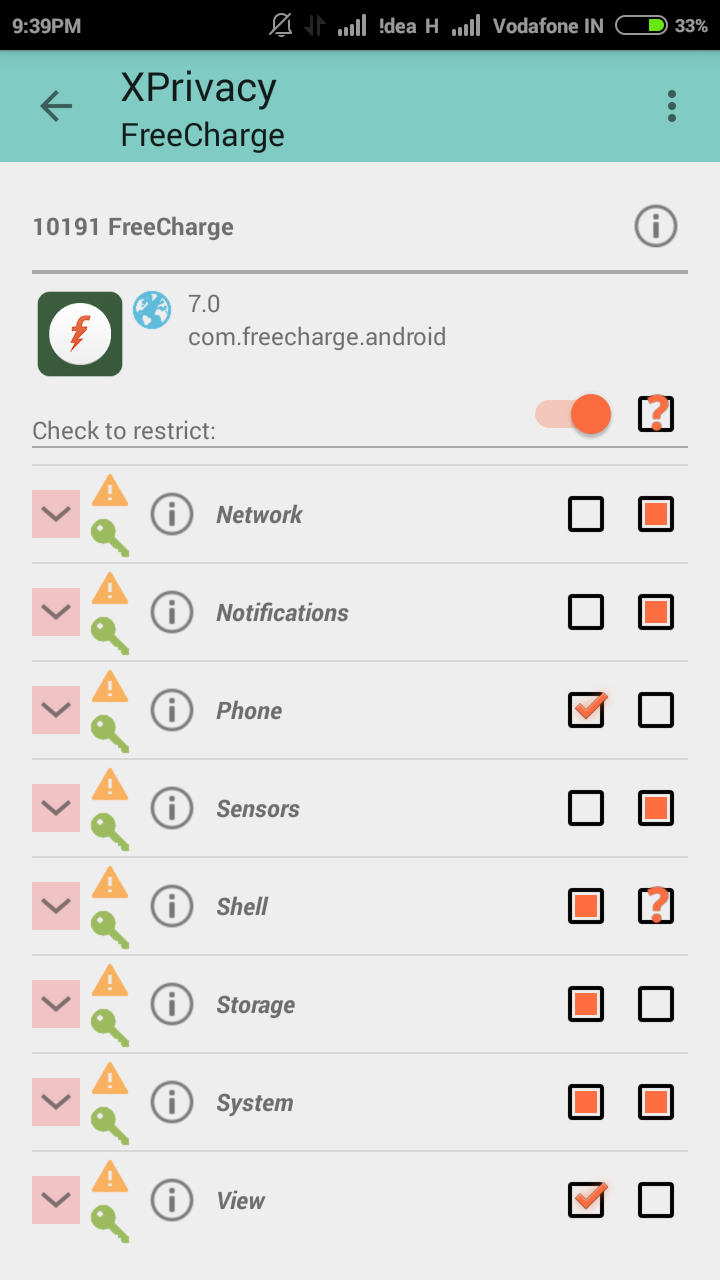 4. Tick on freecharge app in xprivacy and click on it and do as follow :