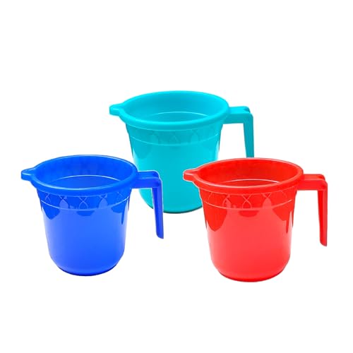 - Plastic Bathroom Mug Heavy Plastic Material & Great Capicity Size 14 x 14 x 12 CM Material: Plastic Material: This bathroom mugs made of virgin plastic materials, strong & durable.Unique & sturdy design, suitable for daily home use. All our plastic is recyclable and can be reused thus not becoming a burden on the environment Package Contents: 2 Piece Bathroom Mug
