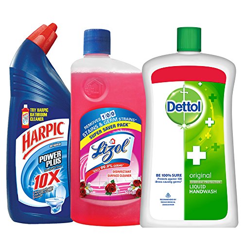 Harpic Household Cleaning Kit (Harpic - 1 L (Rose), Lizol - 975 ml (Floral), Dettol Hand Wash - 900 ml (Original)