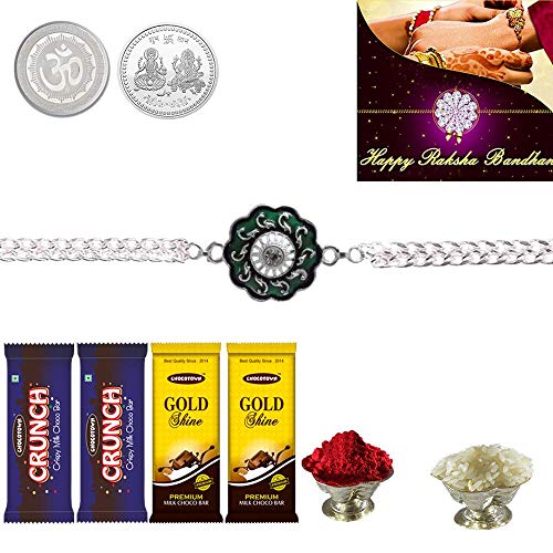 Rakshbandhan Special Rakhi Combo - Designer Rakhi Silver Color / Plated Rakhi (Q1_F56_CG2) Green Round Design Rakhi with Chocotown Crunch(2pc) & Gold Milk Choco Bar(2pc), Roli chawal, Pooja Coin & Greeting card | Rakhi with chocolates | Rakhi gift fo