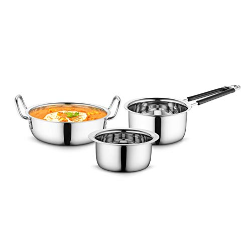 Profusion Stainless Steel Cookware 3 pcs Set - (Silver, Tope- 0.8 Litre, Karahi- 1.5 Litre, Sauce Pan- 0.9 Litre)