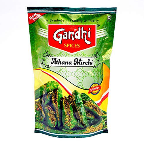 Authentic Rajasthani athena mirchi pickle from the brand Gandhi. Gandhi is renowned for its wide range of mmarwaripickles Finest ingredients & traditional recipe used to ensure genuine texture and flavour Made from the special breed of chillies that are fleshy, long and are grown in athana village Stuffed with salt, mustard, fenugreek, dry mango powder, saunf, hing and other spices to ensure the true taste of Rajasthani pickles Gandhi: a symbol of quality & purity Total weight: 400 grams Shelf Life: 120 days