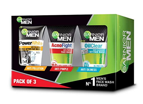 Garnier Men FaceWash Kit (Acno Fight Anti-Pimple Facewash, 100gm+Oil Clear Clay D-Tox Deep Cleansing Icy Face Wash, 100gm+Power White Anti-Pollution Double Action Facewash, 100gm